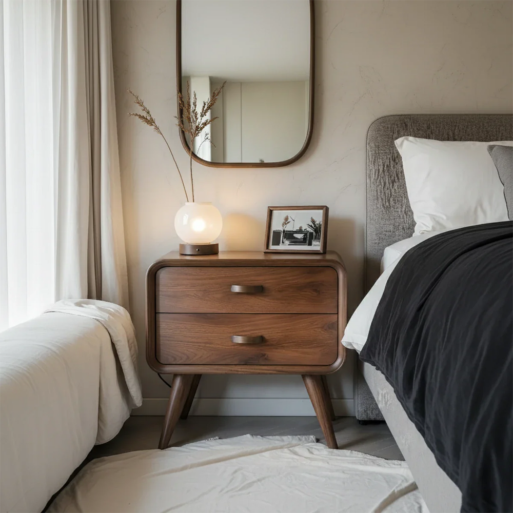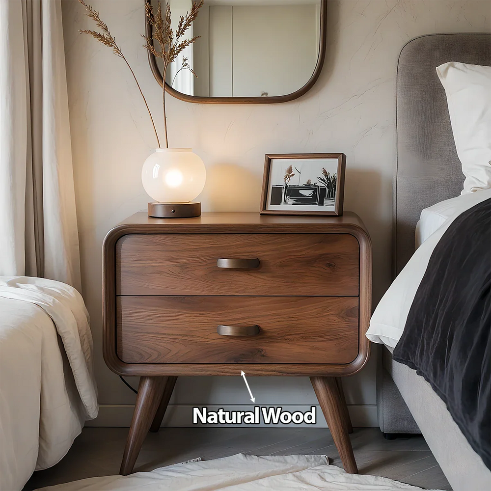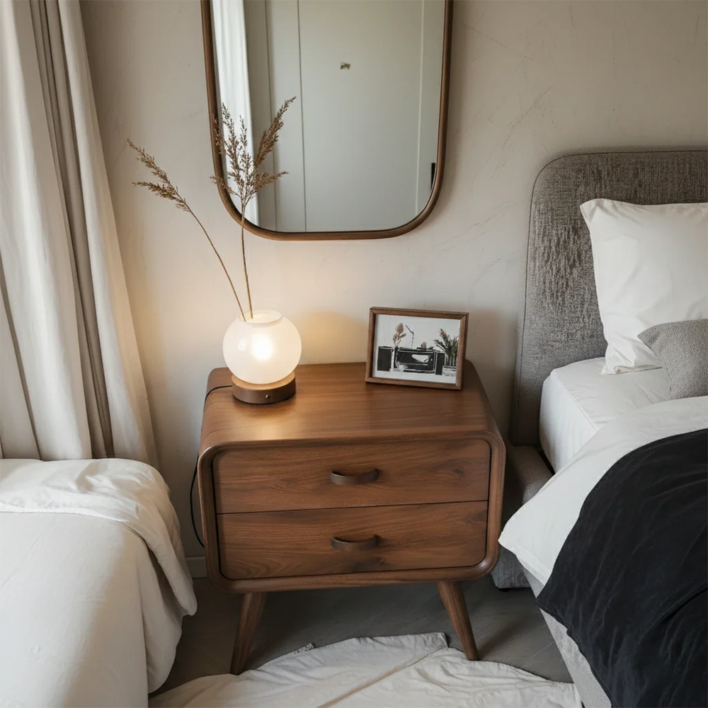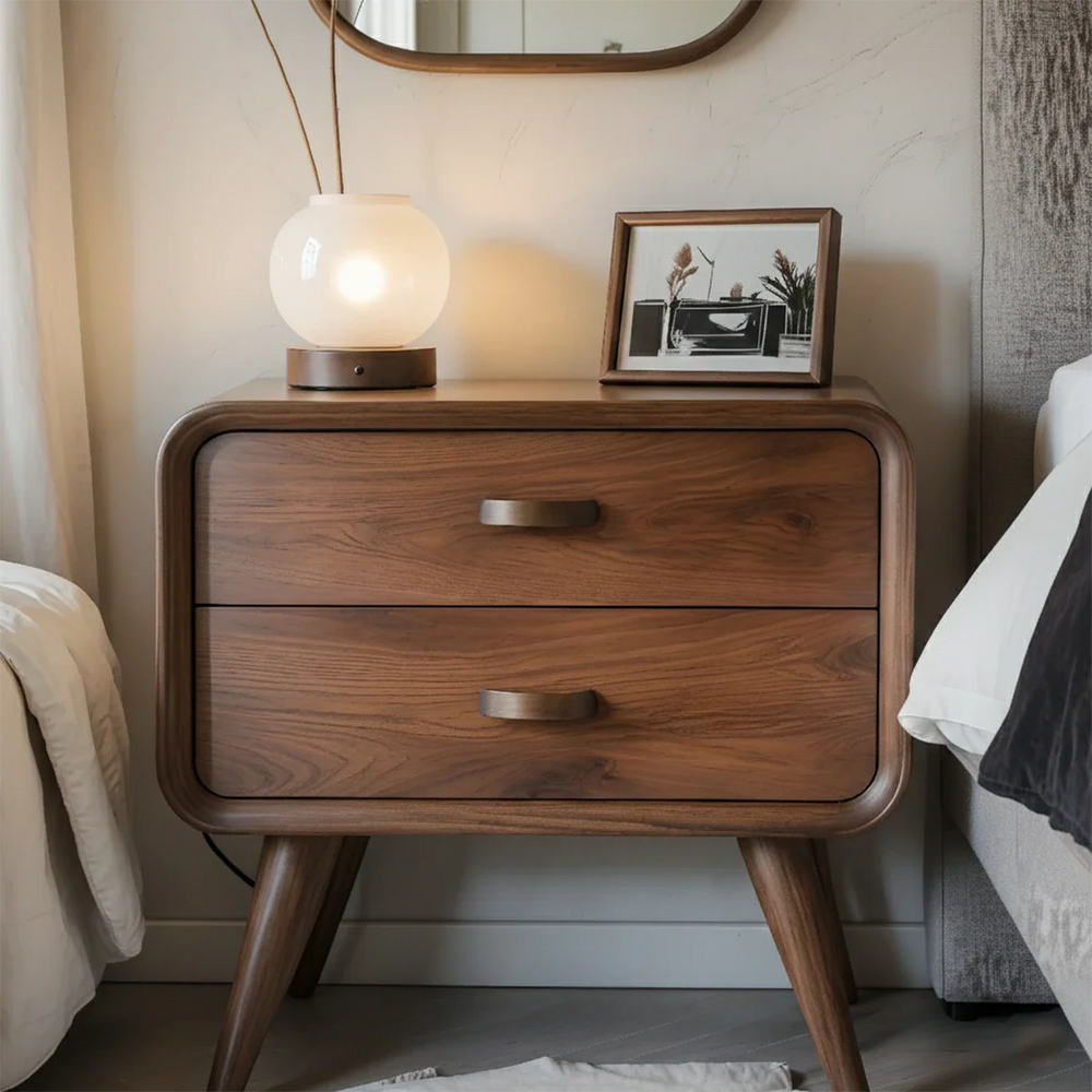 Its rounded frame, tapered legs, and smooth edges create a sculptural softness, perfectly suited for Mid-Century Modern, Minimalist, and Japandi interiors. Two spacious drawers glide effortlessly, offering quiet, essential storage for nighttime items while preserving a clean and uncluttered visual flow.